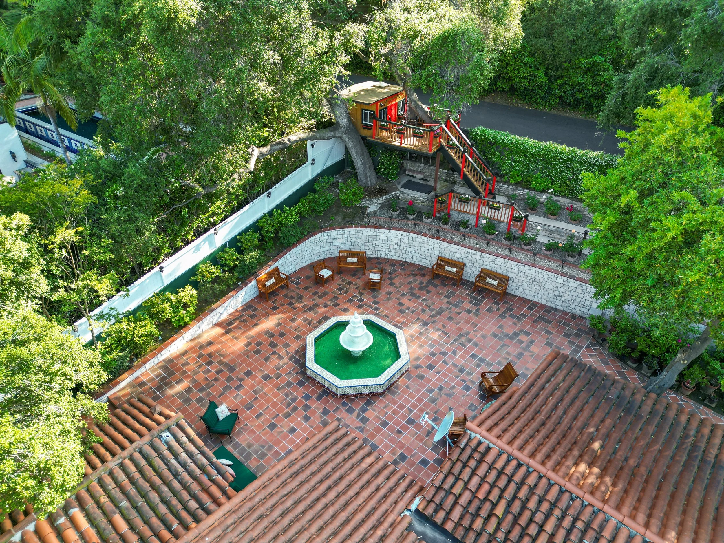 The professionally landscaped grounds reveal a series of inviting gathering areas/vistas; multiple fountains, a Koi pond, a whimsical treehouse hideaway, and two custom-built workshop/storage structure are all seamlessly integrated into the beauty of lush greenery, manicured paths and flowering pots. This refined and enchanting retreat is awaiting a new owner to enjoy for years to come!