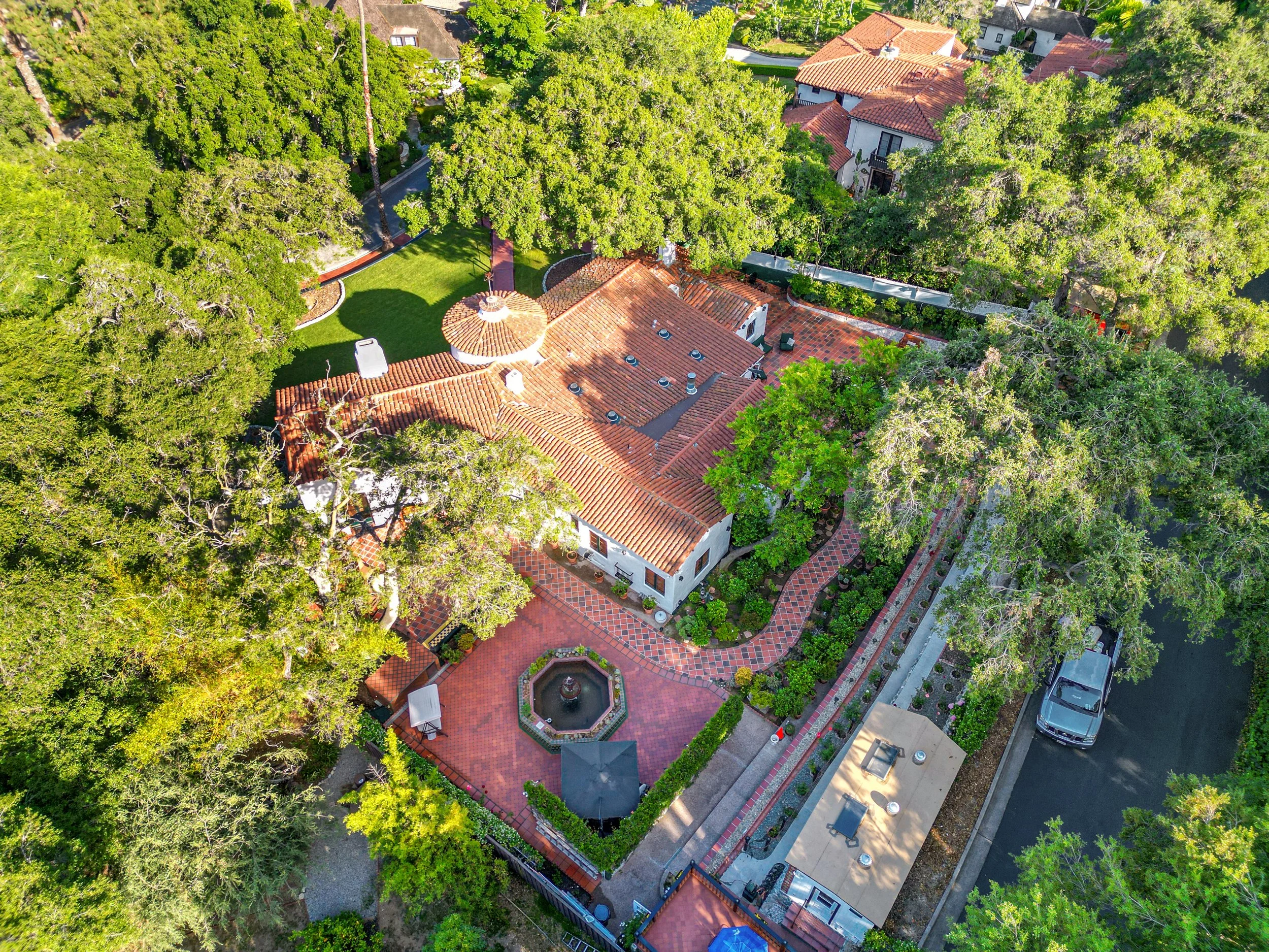 A lush, expansive lawn and custom tile in-laid path lead to an understated arched entry. The splendid foyer welcomes with artisanal terra-cotta flooring, a striking wrought iron chandelier, and soaring groin vault ceiling—immediately setting the stage for the home’s timeless charm.