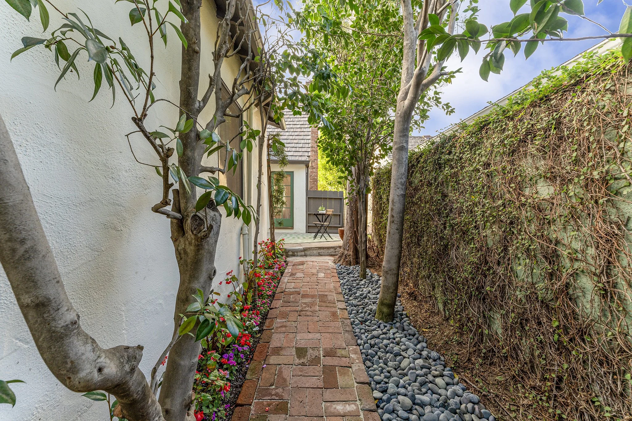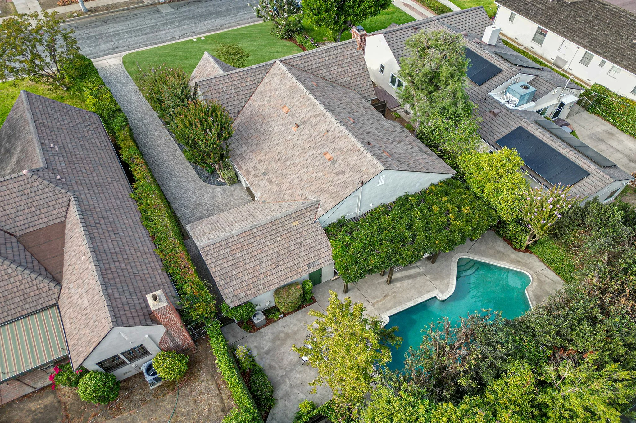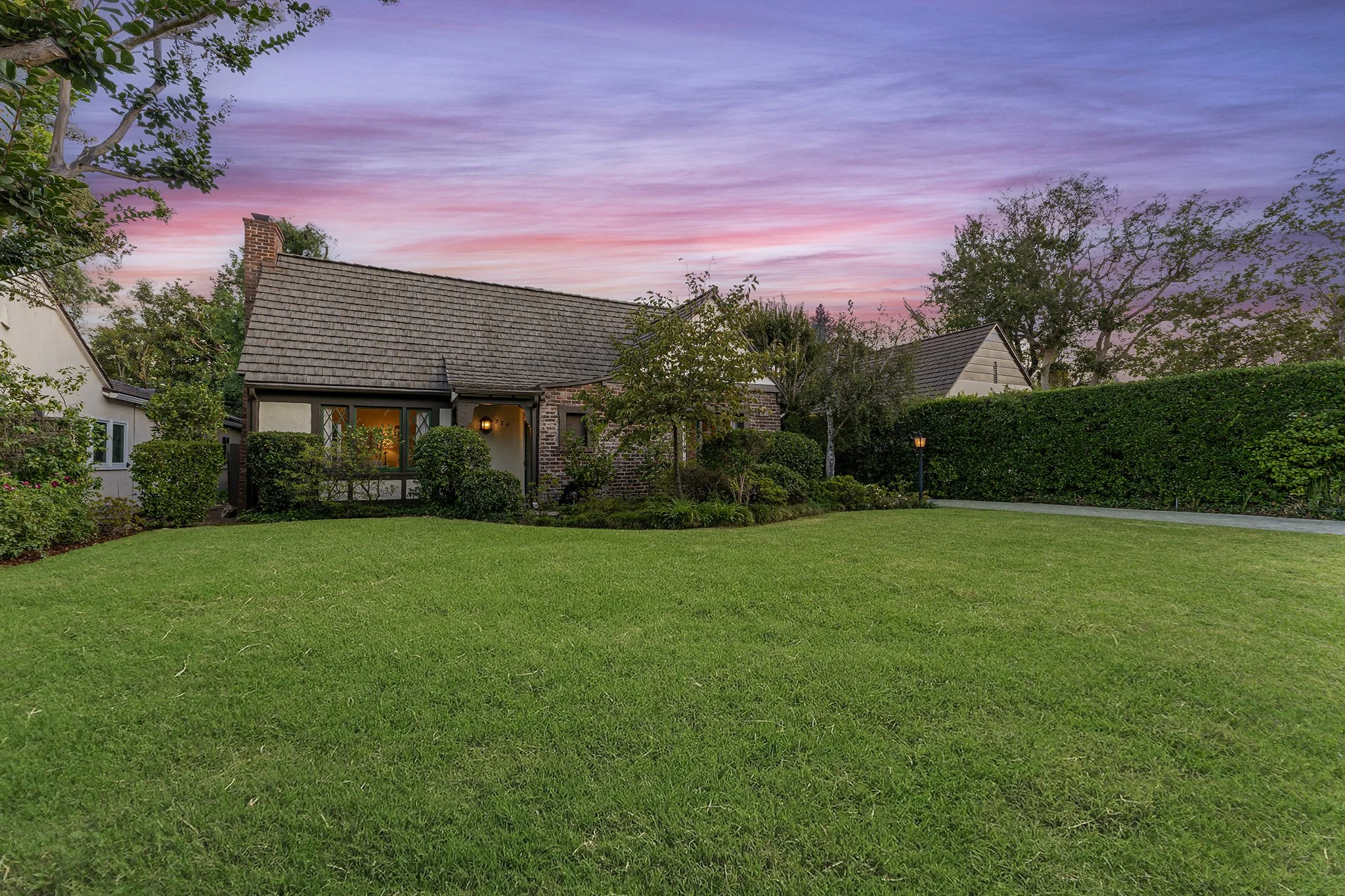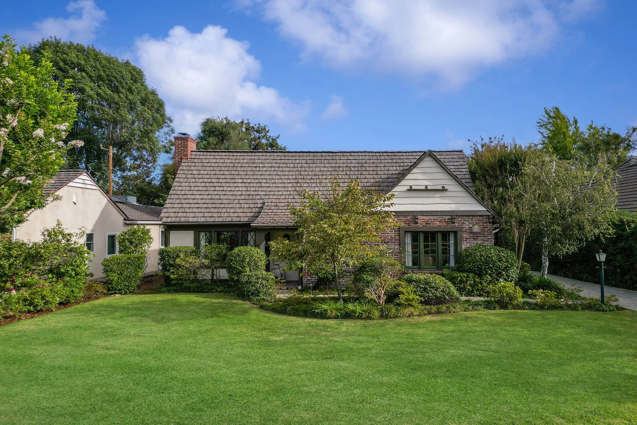 Nestled on a quiet street in San Marino’s highly desirable Mission District, this English Cottage evokes the timeless charm of the countryside. With its steeply pitched roof, aged brick façade, and diamond-pane windows, the home radiates warmth and storybook appeal. A paver stone walkway meanders through lush flower beds to the inviting porch featuring arched wood beams that accent a vintage paneled door create a welcoming prelude to the home. Beyond the entry, built-in shelves and a petite view window lead into the dramatic living room, revealing soaring vaulted ceilings with exposed beams, gleaming hardwood floors, anchored by a striking stone fireplace with raised hearth and rustic wood mantel. A French door opens to the side patio, blending indoor and outdoor living. The formal dining room, illuminated by an opaque glass chandelier and abundant natural light, opens to the sunny breakfast room featuring a wrought-iron chandelier adorned with hand-painted ceramic accents, walls of cabinetry, a convenient prep sink, and a tiled serving counter that connects seamlessly to the kitchen—perfect for casual meals or morning coffee. The functional kitchen is appointed with tiled countertop, matching backsplash, and custom cabinetry. A versatile mudroom with laundry and an adjoining three-quarter bath adds everyday convenience, while a side door opens to the paver driveway that leads to the detached garage. A central hallway leads to the home’s private quarters, where one bedroom features a walk-in closet and French doors to the side patio. At the end of the hall, a flexible primary suite can be closed off for added privacy and offers double closets, tranquil views of the backyard, and a primary bath with dual sinks. A third bedroom doubles as an office or den, enhanced by built-in bookcases and French doors that open to a wisteria-draped pergola—an enchanting setting for dining al fresco. The private backyard unfolds as an oasis of relaxation and leisure, with a sparkling pool surrounded by lush hedges and mature trees, offering the perfect retreat for lounging by the water or gathering with friends on warm evenings. Combining classic English charm with the best of California living, this quintessential cottage is truly your home sweet home!